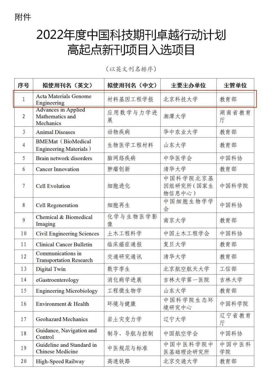 9月21日,中国科技期刊卓越行动计划办公室发布了《关于下达2022年度中国科技期刊卓越行动计划高起点新刊入选项目的通知》。经过项目申报、资格审查、答辩评审等流程,由我校主办的《材料基因工程学报》(Acta Materials Genome Engineering)成功入选“2022年度中国科技期刊卓越行动计划高起点新刊项目”。