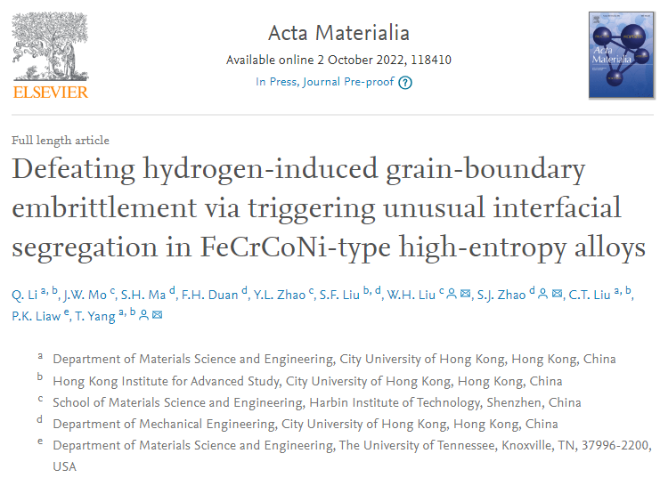 该论文的第一作者为香港城市大学材料科学与工程系的李倩。 其他主要合作者包括美国田纳西大学的P.K. Liaw教授,哈尔滨工业大学(深圳)W.H. Liu教授 (共同通讯),香港城市大学S.J. Zhao教授(共同通讯);哈尔滨工业大学(深圳)Y.L. Zhao教授等。该研究受到了香港研究资助局(NSFC),国家自然科学基金(NSFC)、广东省科技厅等项目的支持。