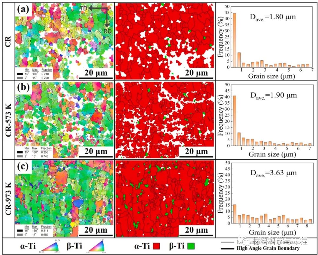 原始组织由等轴α晶粒和短棒β晶粒组成,CR后,晶界处分布着细长的β晶粒。随着后续退火温度的升高,晶粒逐渐长大,并表现出明显的球化行为。随着退火温度的升高,HAGBs逐渐增加,LAGBs主要分布在晶粒中,LAGBs可以在一定程度上表征材料中的位错水平。973 K退火后,位错密度仍然很高,这是保持样品高强度的关键。