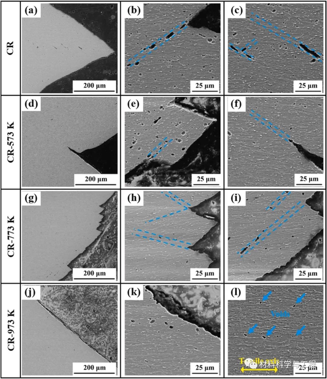 由于大量的位错、亚晶等亚结构倾向于聚集在CR后形成的局部剪切带中,因此在这些区域通常存在应力集中和开裂。此外,细β相与剪切带中α相之间的弱界面也是裂纹更容易成核的地方。在拉伸变形过程中,剪切带的运动受到β相或晶界的阻碍,导致大量的局部应力。裂缝和空隙在这些位置迅速成核和传播,最终导致断裂。随着退火温度的升高,在高变形储能区中会发生优先回复、成核和结晶,从而改善微观结构均匀性。因此,裂纹和空隙的成核更加随机,样品可以承受更大的变形并表现出优异的塑性。