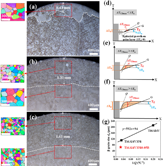 图1 Ti6Al4VxNiyB顶部的β-晶粒和最后一层的初始凝固机制。(a),(d) Ti6Al4V; (b),(e) Ti6Al4V3Ni; (c),(f)Ti6Al4V3Ni0.05B; (g)晶粒尺寸d0与反Q的关系图。TE是平衡液相温度,Tn是成核的临界过冷度)。