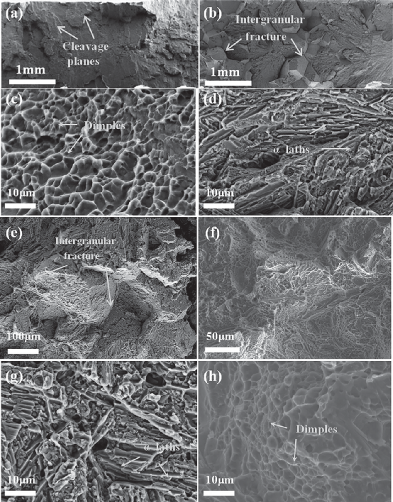图5 纵向试样的断裂面:(a)(c)建成的Ti6Al4V,(b)(d)建成的Ti6Al4V3Ni,Ti6Al4V3Ni0.05B(e)(f)建成的和(g)(h)热处理过的。