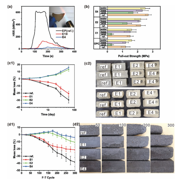 近期,青岛理工大学金祖全和东南大学张云升合作针对混凝土检测技术的痛点难点,开发出了一种水性环氧树脂改性的水泥基复合涂层传感器。他们采用水泥的基本结构(C-S-H凝胶结构)作为传感器骨架,通过在2,2-双(苯基-4-缩水甘油氧基)丙烷分子中硅氧烷和聚醚链段的嵌段接枝,形成具有油水两亲性的星形分子。这使得水性环氧聚合物基质和混凝土在亚微观尺度上在三维空间中呈现相互渗透,从而形成坚固且抗裂的材料组织。为保证功能性纳米碳材料均匀分散,通过加入[3-(2-氨基乙基氨基)-丙基]三甲氧基硅烷(AEAPTMS)硅倍半氧烷(POSS),使得纳米碳材料表面以氢键和离子键形成有机-无机偶联层,防止纳米碳材料团聚。所得到的材料柔韧性、抗冻性和附着性能均有较大提高,可以实现持续监测结构的应力-应变和开裂过程。更重要的是这种材料不需要预先将传感器埋入混凝土中,只需要通过涂覆的方式既可以实现对缓凝土损坏程度的检测。该工作以题为“Ultraductile Cementitious Structural Health Monitoring Coating: Waterborne Polymer Biomimetic Muscle and Polyhedral Oligomeric Silsesquioxane-Assisted C-S-H Dispersion”的文章发表于Advanced Functional Materials上。