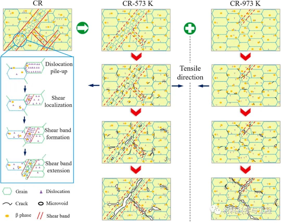 由于大量的位错、亚晶等亚结构倾向于聚集在CR后形成的局部剪切带中,因此在这些区域通常存在应力集中和开裂。此外,细β相与剪切带中α相之间的弱界面也是裂纹更容易成核的地方。在拉伸变形过程中,剪切带的运动受到β相或晶界的阻碍,导致大量的局部应力。裂缝和空隙在这些位置迅速成核和传播,最终导致断裂。随着退火温度的升高,在高变形储能区中会发生优先回复、成核和结晶,从而改善微观结构均匀性。因此,裂纹和空隙的成核更加随机,样品可以承受更大的变形并表现出优异的塑性。