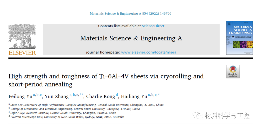 来自中南大学的喻海良团队研究了Ti-6Al-4V板材深冷轧制及后续短周期真空退火过程中组织演变规律,建立组织与力学性能之间的关系。此外,从相分布和局部剪切带的发展等方面讨论了Ti-6Al-4V板材的塑性变形行为。相关论文以题“High strength and toughness of Ti–6Al–4V sheets via cryorolling and short-period annealing”发表在Materials Science & Engineering A。