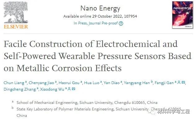 近日,四川大学机械工程学院的吴晓东研究员、甘芳吉副教授和张顶成副教授合作,巧妙地利用身边随处可见的金属腐蚀现象,通过合理的材料选择、组分优化、结构设计和系统集成,成功研发了一种新型电化学柔性压力传感器,实现了对静态和低频动态力学刺激的无源式监测,在多种人体生理信号监测方面表现出良好的应用前景。相关成果以 “Facile Construction of Electrochemical and Self-Powered Wearable Pressure Sensors Based on Metallic Corrosion Effects” 为题,发表在国际著名期刊《Nano Energy》上(影响因子:19.1),论文第一作者为四川大学机械工程学院2019级本科生梁春。