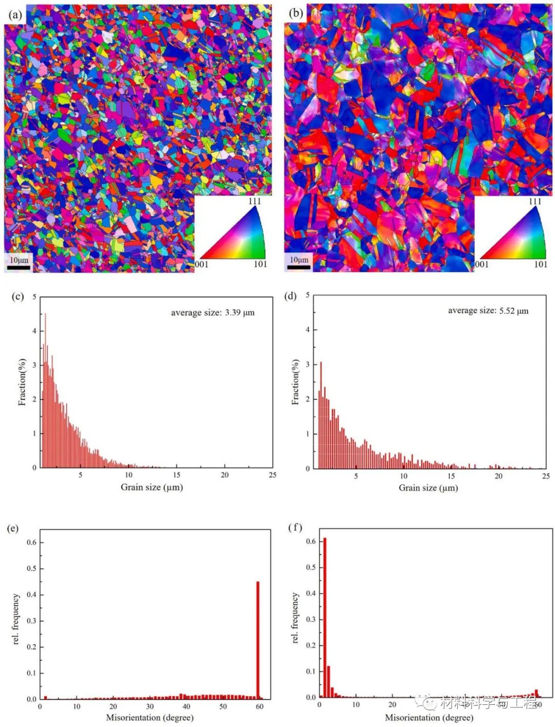 研究发现,随着电流的增加,δ相的面积分数也随之增大,说明大电流促进了δ相的析出,这种促进作用部分归因于试样温度升高。将130A通电30min试样与在780℃热处理30min试样进行对比,发现电流处理的试样晶粒尺寸(约3.39μm)明显小于普通热处理试样的晶粒尺寸(5.52μm),且电流处理后出现大量孪晶,大部分晶界是大角度晶界,晶粒出现一定旋转,上述作用共同抑制了晶粒长大。