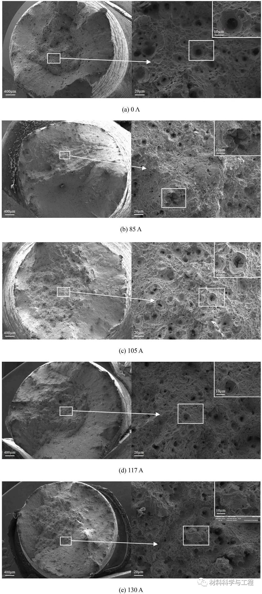 拉伸结果表明,屈服应力先随电流的增大而增大,达到最高值后随电流增大而减小,电流处理后试样表现出更低的延展性,电流在105A以下时,第二相强化是主要强化机制,δ相数量增加导致强度提升,电流大于105A时,位错密度下降,由于焦耳热效应导致材料出现一定程度软化,减少了位错与δ相之间的相互作用。