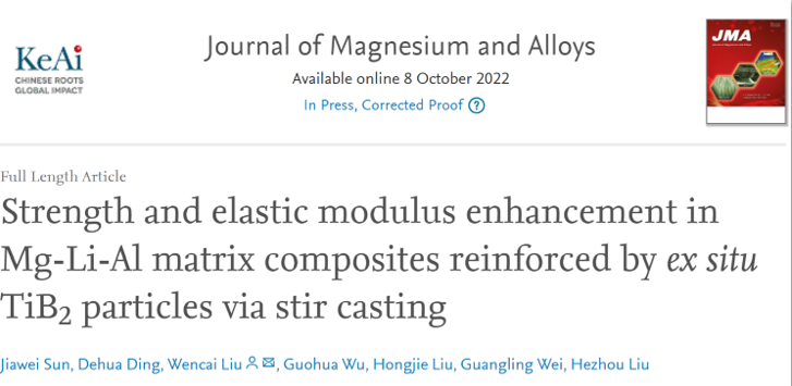 上海交通大学刘文才教授团队等人将相关研究成果以题为“Strength and elastic modulus enhancement in Mg-Li-Al matrix composites reinforced by ex situ TiB2 particles via stir casting”发表在期刊Journal of Magnesium and Alloys上。