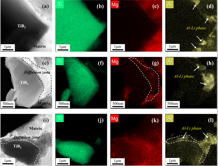 不同预处理工艺铸态复合材料基体与TiB2颗粒界面的DF-STEM图像和EDS分析:(a-d)TiB2 /LA103;(e-h)Mg-TiB2 /LA103;(i-l)Al-TiB2 /LA103