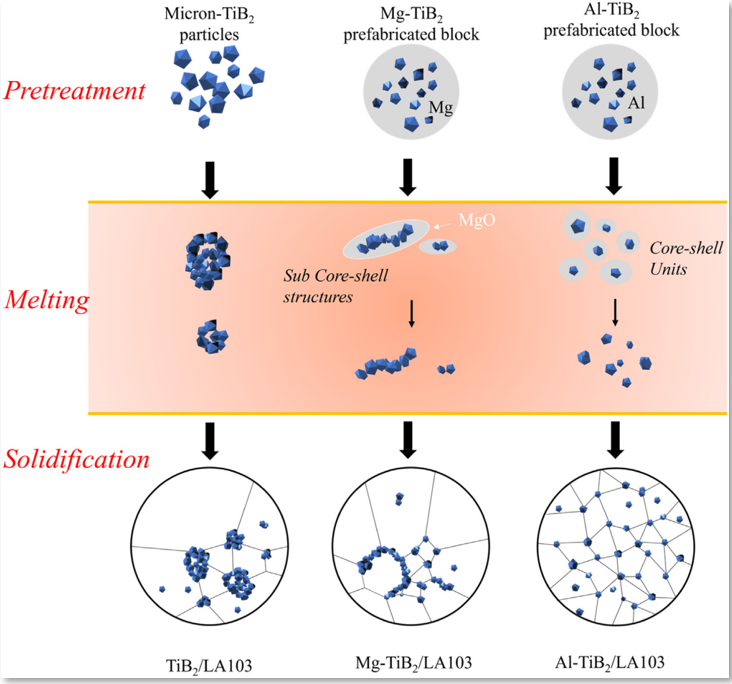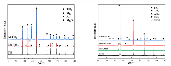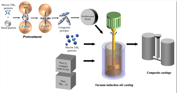 考虑到Mg-10Li-3Al的低密度(1.49 g/cm3)和TiB2的高弹性模量(550 GPa),本研究选择Mg-10Li-3Al基合金与微米TiB2颗粒作为复合体系。Al在合金(LA103)中的加入保证了Mg-Li合金的强度。同时,作为一种典型的单相体心立方(bcc) Mg-Li合金,可以排除其他元素的干扰,更好地研究与TiB2粒子的界面相互作用。将TiB2颗粒以冷压预制块的形式添加到搅拌熔体中,由复合粉末(将TiB2颗粒与Mg颗粒或Al颗粒混合,然后进行球磨)组成。提高了8 wt.% TiB2 /LA103基复合材料的强度和弹性模量,研究了复合材料的力学性能和微观结构,所研制的材料具有比模量和塑性性能的平衡。