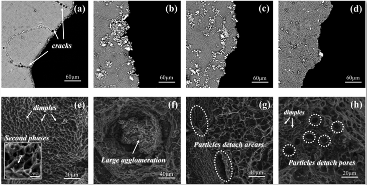 不同预处理工艺制备的铸态LA103合金及复合材料拉伸断口形貌及断口侧视图的SEM图像:(a)(e)LA103;(b)(f)TiB2/LA103;(c)(g)Mg-TiB2/LA103;(d)(h)Al-TiB2/LA103