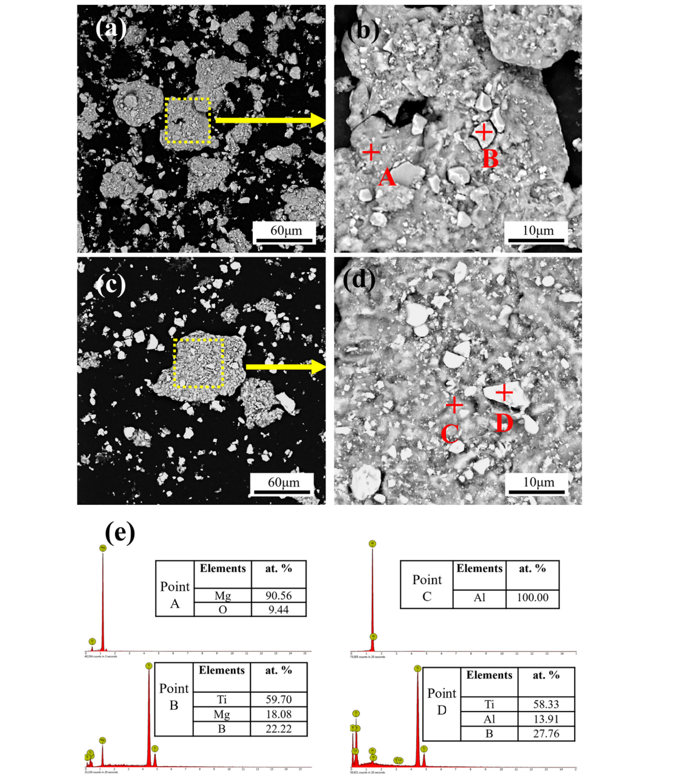 Mg-TiB2和Al-TiB2复合粉末的SEM-BSE图像和EDS分析:(a)Mg-TiB2;(b)Mg-TiB2的高倍率图像;(c)Al-TiB2;(d)Al-TiB2的高倍率图像;(e)EDS分析结果