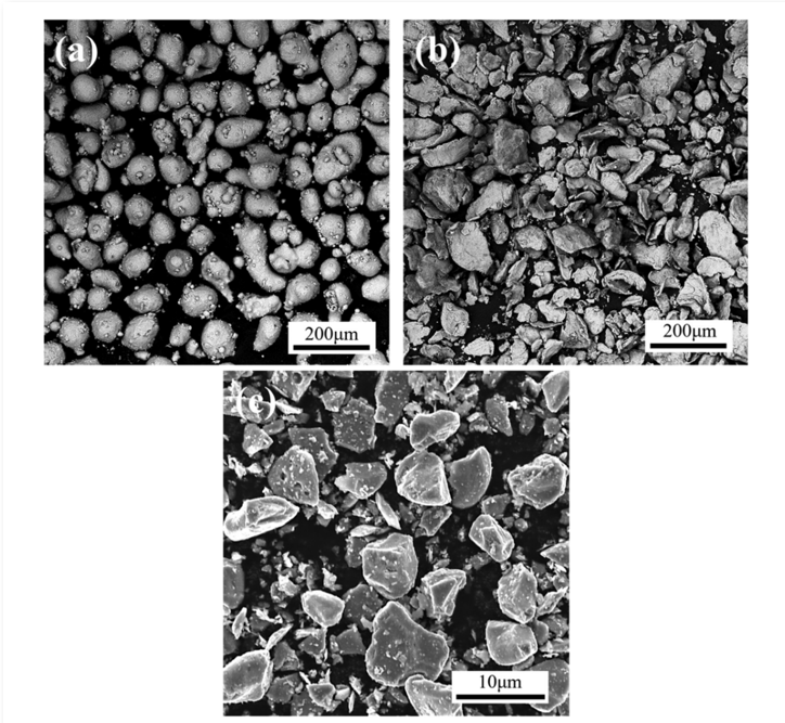 原颗粒的SEM图像:(a) Mg颗粒;(b)铝粒子;(c)微米级TiB2颗粒