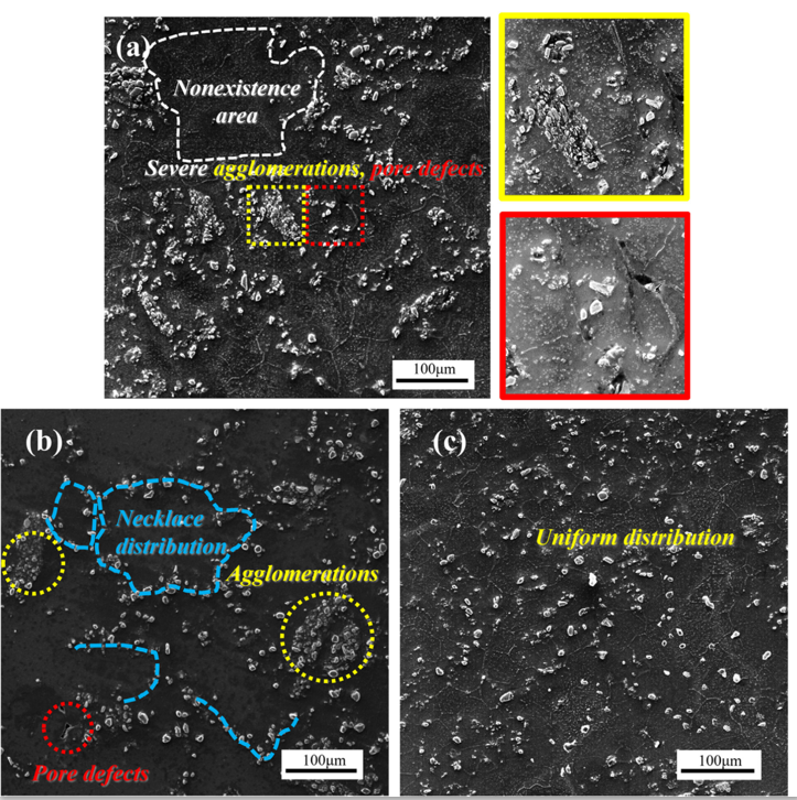 此外,金属基复合材料的制备方法是至关重要的,它直接影响复合材料的微观结构(配筋分布)和性能。目前的研究更多地集中在粉末冶金的制备方法和门槛成本较高的渗透方法上,而不是在工业领域可行的搅拌铸造方法。在制备方法上,虽然粉末冶金制备的材料具有较好的微观组织可控性,但不可否认的是搅拌铸造是金属基复合材料中使用最多的方法,其成本低、工艺简单、规模大,是不可替代的。然而,不理想的铸造工艺可能导致严重的缺陷,如气孔、氧化夹杂和界面反应。此外,当颗粒体积分数较高时,由于陶瓷颗粒在熔体中的润湿性较差,微纳米级增强颗粒的比表面能较大,复合材料会发生大规模团聚,从而降低了力学性能。为了改善金属基复合材料的团聚问题,人们研究了包括PVD、电镀和化学方法在内的表面处理方法,以及热挤压和等通道角挤压(ECAP)等后处理方法,但这无疑会增加材料制备的复杂性。