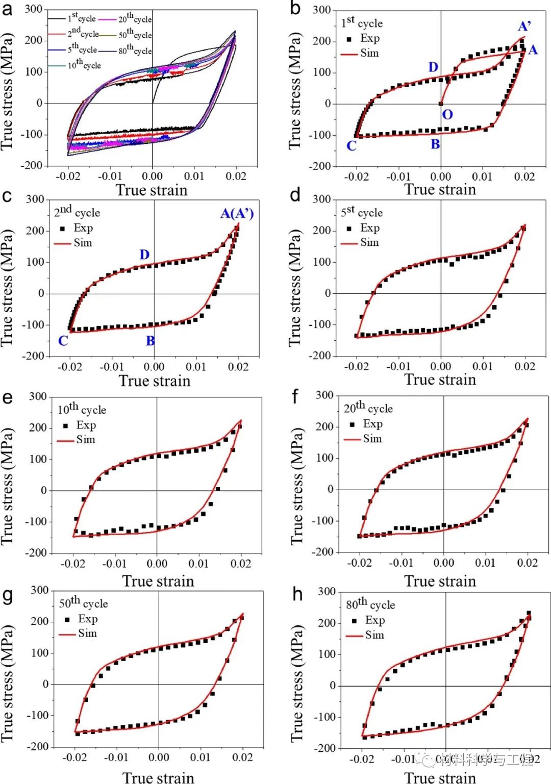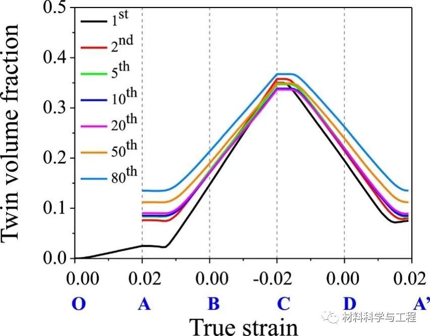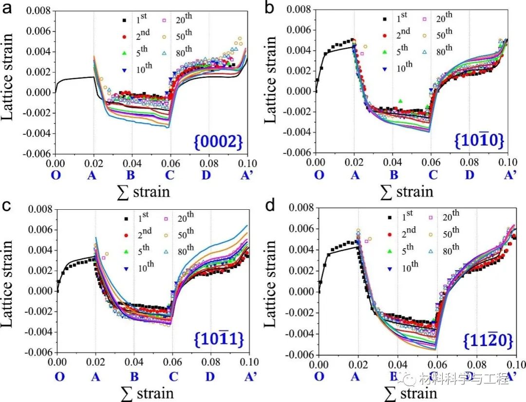 镁合金是迄今已知最轻的金属结构材料,在先进轨道交通和航空航天领域的大规模应用将有助于轻量化和节能减排。镁合金结构件在服役过程中不可避免地承受循环载荷而发生疲劳失效。基于安全性及可靠性要求,镁合金疲劳行为的相关研究至关重要。利用模型进行数值模拟是定量研究镁合金疲劳变形行为的有效手段。然而强织构镁合金的低周疲劳主要由孪晶-退孪晶交替主导,对传统的本构模型提出了很大的挑战。因此,在先前的模拟工作中往往难以同时准确预测镁合金低周疲劳行为的力学响应和变形机制。本研究采用考虑孪生与退孪生行为的弹粘塑性自洽(EVPSC-TDT)模型模拟了AZ31镁合金沿RD方向应变幅值为±2%条件下的低周疲劳行为,通过对比实验测得的应力-应变曲线、峰值应力和孪生体积分数等验证模型的有效性。此外,首次预测了镁合金全周期疲劳过程中晶格应变演化,并结合中子衍射实验结果,揭示了镁合金循环变形中的孪生-退孪生行为及循环硬化机理。近日,南京工业大学先进轻质高性能材料研究中心信运昌教授与中国矿业大学力学与土木工程学院郭晓倩副教授等人合作,采用修正的考虑孪生与退孪生行为的弹粘塑性自洽(EVPSC-TDT)模型,对AZ31镁合金板材的低周疲劳行为进行了数值模拟(加载方向:轧制方向,应变幅值:±2%),并与实时原位中子衍射测定的力学响应和变形行为进行了比较。模拟结果很好地预测了全疲劳周期的迟滞回线和循环硬化响应,以及最大孪晶体积分数和残余孪晶的演化。首次准确预测了晶格应变在整个疲劳周期中的演化规律。此外本工作还发现在疲劳循环过程中,最大孪晶体积分数随疲劳循环次数呈现出“先增加-后减小-再增加”的变化趋势。这一发现纠正了先前认为最大孪晶体积分数在初始阶段增加-后期趋于饱和的观点。基于模拟结果对循环硬化机理也提出了新的见解:本研究认为压缩阶段的循环硬化主要与不可逆位错导致的孪晶界固化和残余孪晶的产生相关,而滑移与孪晶的相互作用是引起拉伸阶段循环硬化的主要原因。该成果以题为“Crystal plasticity modeling of low-cycle fatigue behavior of an Mg-3Al-1Zn alloy based on a model, including twinning and detwinning mechanisms” 发布在Journal of the Mechanics and Physics of Solids上,其中郭晓倩副教授为论文第一作者,成瑶博士为论文的共同第一作者,信运昌教授为论文的通讯作者。https://doi.org/10.1016/j.jmps.2022.105030综上所述,该研究利用EVPSC-TDT模型成功地预测了整个循环周期的力学响应和变形行为。首次模拟了晶格应变在整个疲劳周期中的演化过程。此外结合中子衍射结果,对整个循环变形中孪生-退孪生行为及循环硬化机理有了新的认识。