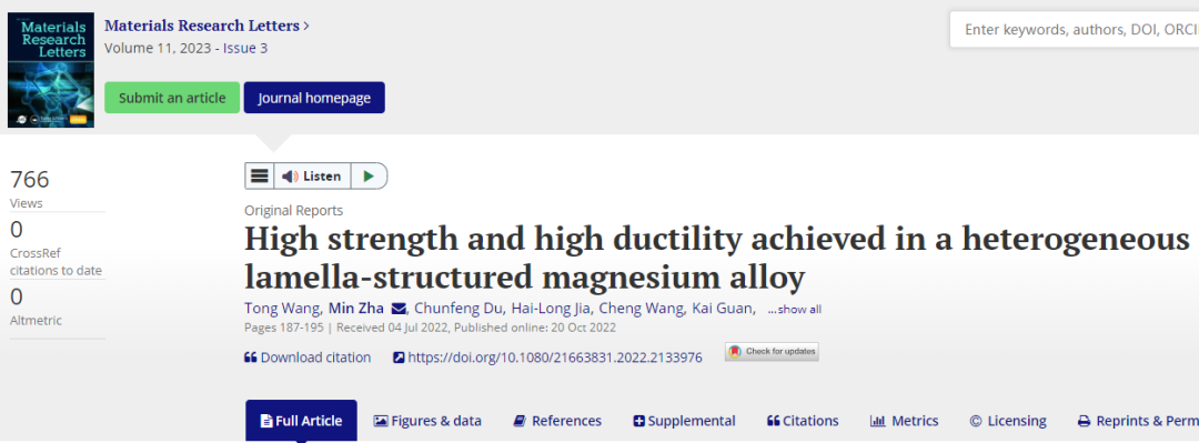 研究结果以题为“High strength and high ductility achieved in a heterogeneous lamella-structured magnesium alloy”发表在Materials Research Letters 上。