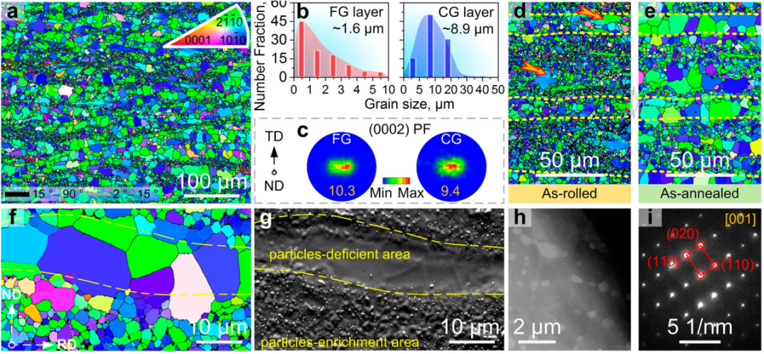 图 1(a)HL-Mg合金的低倍率IPF图;(b)FG层和CG层的粒度分布;(c)FG层和CG层的(0002)PFs。(d)和(e)轧制样品和退火样品的IPF图;(f)和(g)典型区域的高倍IPF和对应的SEM微观结构;(h)和(i)TEM分析显示Mg17Al12颗粒主要沿FGs的GBs分布。