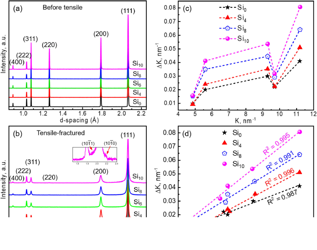 图3 (CoCrFeNi)的中子衍射曲线100-x四x(x: 0, 4, 6, 8, 10 at.%)高熵合金(a)在拉伸前和(b)破裂后。(c)常规Williamson-Hall图显示了K和△K之间的关系。(d) 修正Williamson-Hall 图。