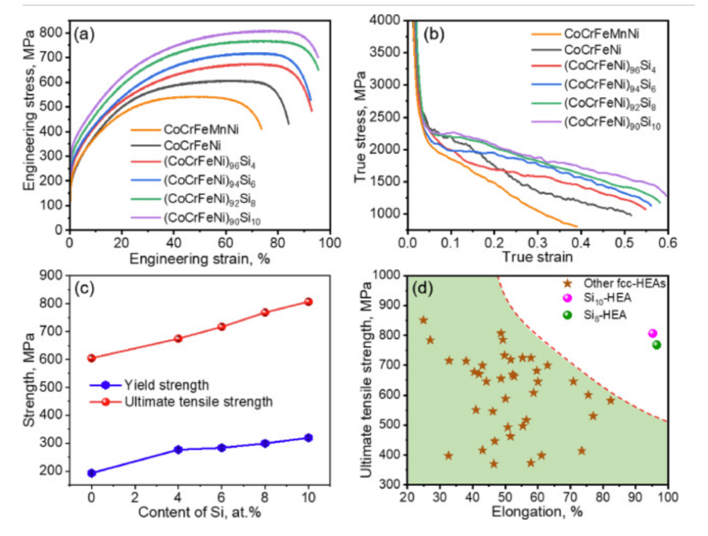 图2(a)拉伸应变-应力曲线;(b)应变硬化速率;(c) Si含量与强度(屈服强度和极限抗拉强度)的相关性;(d)与之前报道的FCC单相HEAs的拉伸伸长率和极限拉伸强度的比较
