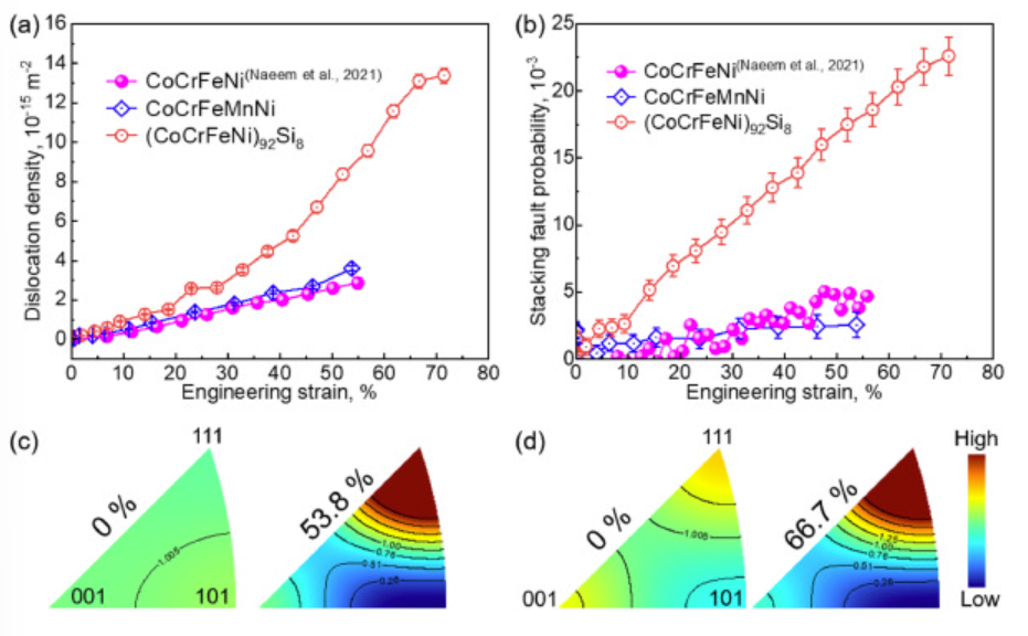 图7 (a)原位中子衍射法测定的CoCrFeMnNi和(CoCrFeNi)92Si8 HEAs在拉伸变形过程中的位错密度和层错概率。插入之前研究的CoCrFeNi HEA的结果进行比较,其值与CoCrFeMnNi HEA的值几乎相同。(c)和(d)反极图显示了两种合金在拉伸前和拉伸变形后的晶粒织构,应变分别为53.8% (CoCrFeMnNi)和66.7% (Si8)。