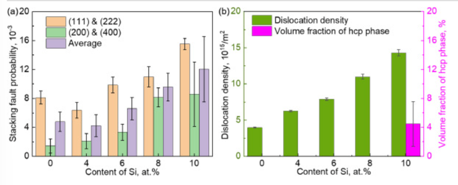 图4 (a)从中子衍射图分析了拉伸断裂(CoCrFeNi)100-xSix (x: 0,4,6,8,10 at.%) HEAs的层错概率、位错密度和HCP相体积分数。