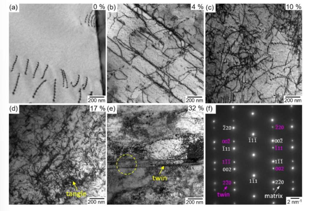 图5 (a - e) 透射电镜明场成像 (CoCrFeNi)100Si0 HEA: (a)退火,(b - e)拉伸变形到工程应变(b) 4%, (c) 10%, (d) 17%和(e) 32%的工程应变。(f) (e)中黄色虚线圈所示区域的选定区域衍射图样,入射光束沿[110]方向。