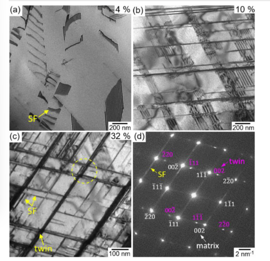 这些高熵合金和多边环境协定的 SFE 范围为 18 至 35 mJ/m2,塑性变形过程中发生的机械孪晶增强了合金的应变硬化和强度。SFE是决定FCC金属塑性机理的主要材料性质,塑性变形从位错滑行(SFE:>45mJ/m2)切换到机械孪生 (SFE:15-45 mJ/m2)和FCC→六方紧密堆积(HCP)应变诱导的相变(SFE:<15 mJ / m2)。