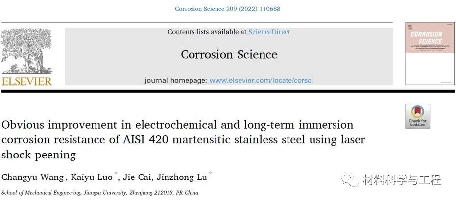 相关论文以题为“Obvious improvement in electrochemical and long-term immersion corrosion resistance of AISI 420 martensitic stainless steel using laser shock peening”发表在Corrosion Science上。