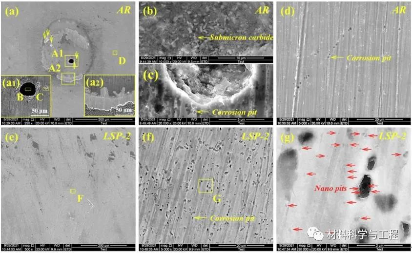 针对马氏体不锈钢的LSP强化处理,近年来的研究主要集中在LSP带来的残余压应力、力学/疲劳性能的改善以及晶粒细化等方面,很少有研究涉及LSP诱导的表面改性对马氏体不锈钢腐蚀性能的影响。先前的研究表明,LSP诱导的超高应变率激光冲击波可以使得富Cr碳化物发生明显的碳化物碎化和溶解现象。此外,由于C和Cr元素在纳米晶和高密度位错中的快速扩散率,塑性变形诱导的纳米碳化物析出变得有可能。上述微观组织的变化都极大地影响着马氏体不锈钢的腐蚀行为,因此,有必要系统地研究LSP引起的基体和碳化物的变化对AISI 420马氏体不锈钢腐蚀性能的影响。