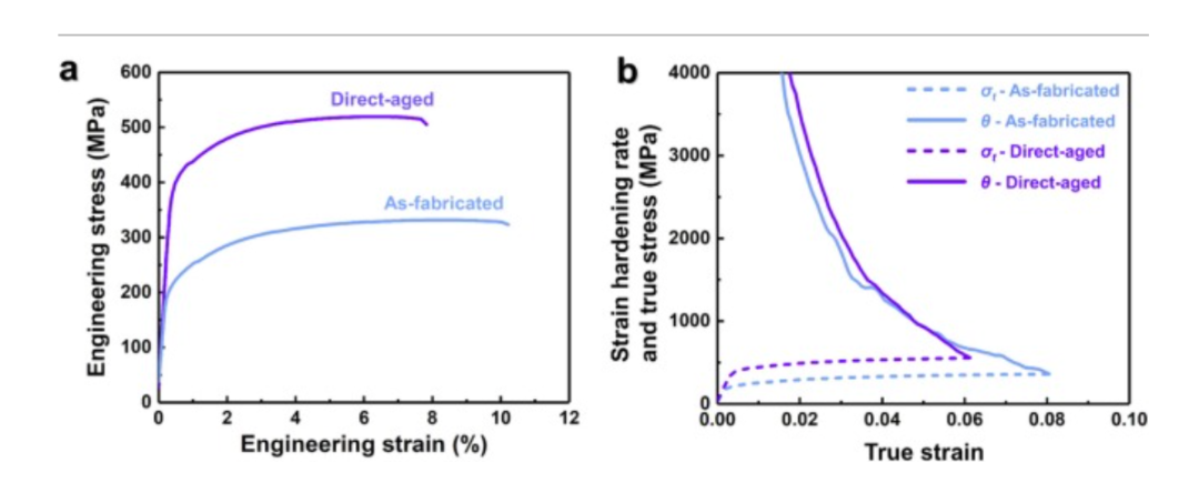 图7(a)显示了预制样品和直接时效样品的工程应力-应变曲线,表4总结了相应的数据。在制造阶段,合金的屈服强度(YS)为230 ± 5 MPa,总伸长率(TE)为10.2 ± 1.1%,而直接时效后分别为425 ± 8 MPa和7.8 ±0.9%。通过简单的后热处理可以获得约195 MPa的急剧增量,同时几乎不牺牲伸长率。此外,L-DED制造的Al-Mn-Sc基合金表现出连续的应变硬化行为,没有屈服下降现象,这对于承重应用至关重要。图7(b)显示了预制和直接时效样品的真实应力和应变硬化速率与真实应变的曲线。同样,它们的应变硬化速率相对于真实应变表现出下降趋势,然而,直接时效样品的应变硬化速率比制造样品下降得更快。