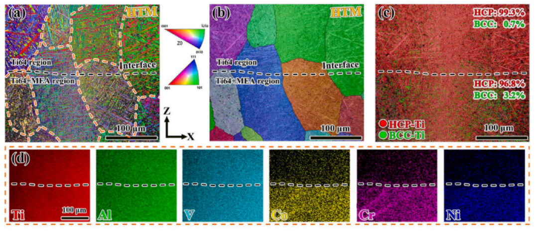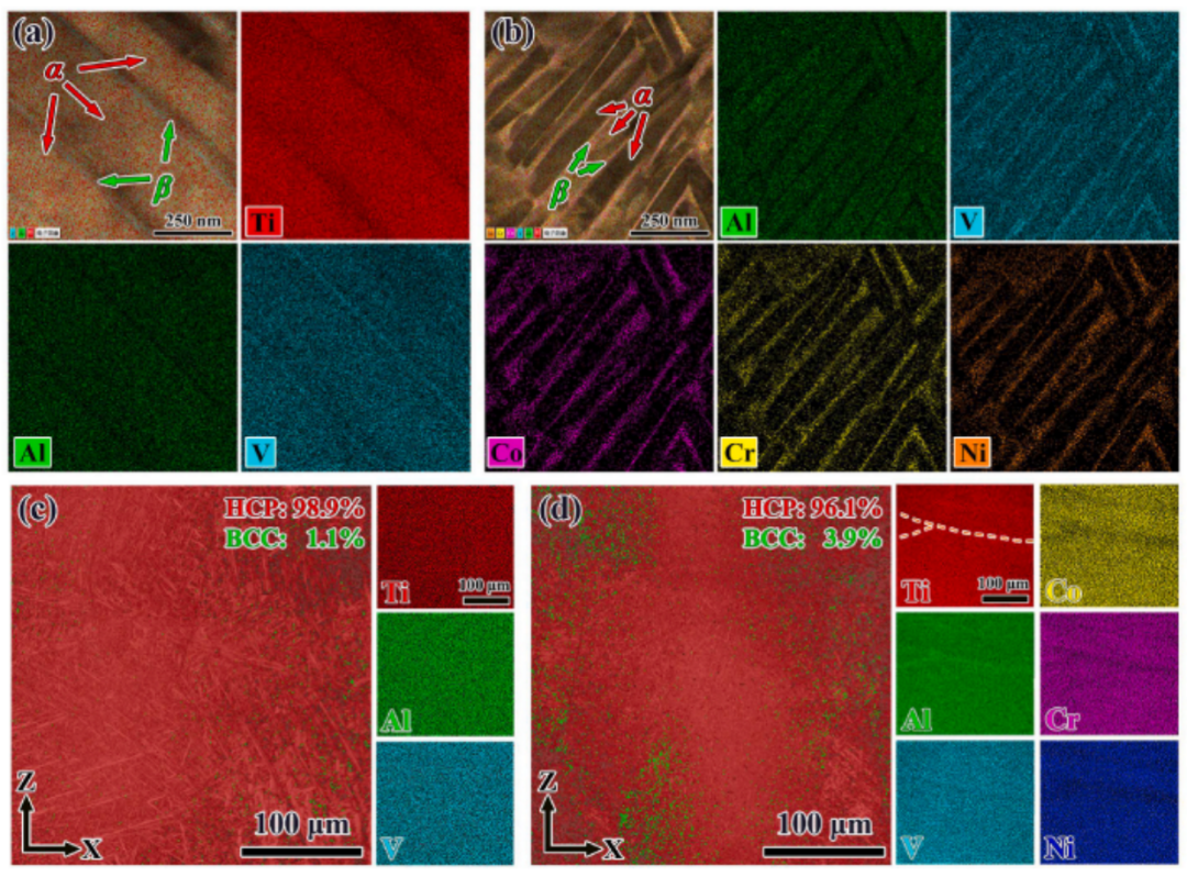 图7 LDED制造的HTM合金的EBSD和EDS分析:(a)α相和(b)重建的先前β晶粒,(c)相图和(d)的IPF取向图相应的 EDS 映射。