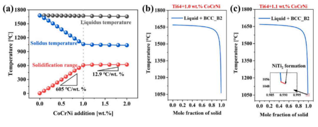图2 Ti-6Al-4V CoCrNi合金的热力学预测结果:(a) Ti-6Al-4V CoCrNi合金在非平衡过程中的凝固温度范围,(b) Ti-6Al-4V+1.0 wt% CoCrNi和(c) Ti-6Al-4V+1.1 wt% CoCrNi合金的Scheil凝固曲线。