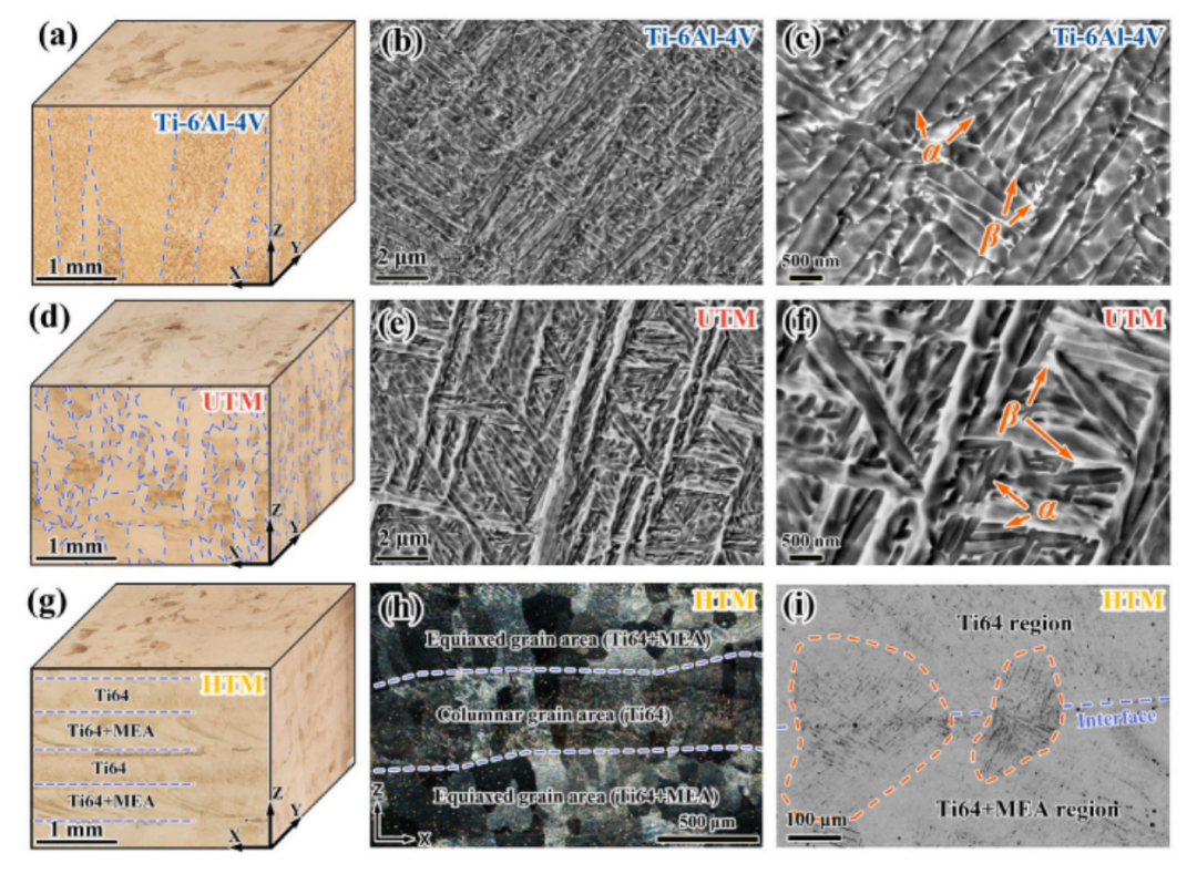 图4 LDED制造的(a-c)Ti-6Al-4V,(d-f)UTM和(g-i)HTM合金的OM和SEM显微照片。