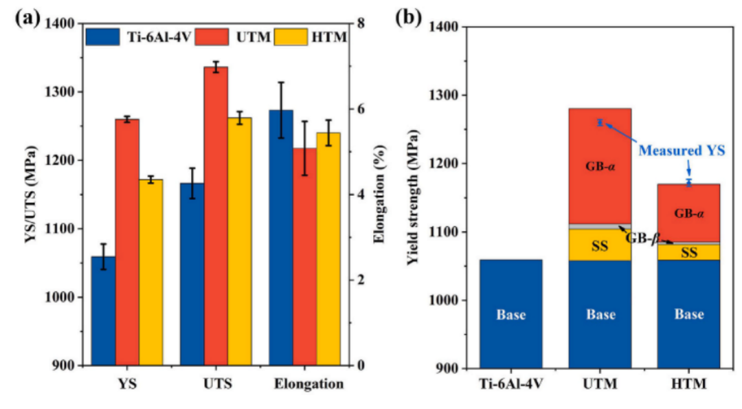 (3)UTM和HTM合金的YS分别达到1260和1172MPa,大大高于Ti–6Al–4V 合金 (1059 MPa)。同时,延展性保持在合理水平(>5%)。α/α板条的晶粒细化导致YS的整体增强。UTM合金良好的延展性是主要源于综合效应的形成超细α/β微观结构和降低的位错密度。对于HTM合金,异质变形之间的Ti–6Al–4V 和 Ti–6Al–4V MEA 层导致变形带,可能会进一步延迟缩颈和提高延展性。