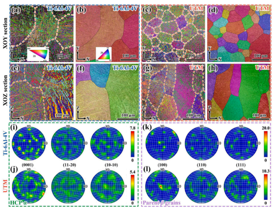 图5 LDED制造的Ti-6Al-4V和UTM合金的EBSD分析:获得LDED制造的(a,b,e,f)Ti-6Al-4V和(c,d,g,h)UTM合金的IPF取向图来自XOY和XOZ截面,(i)Ti-6Al-4V和(j)UTM合金中α相的PF,以及(k)Ti-6Al-4V和(l)UTM合金重建的先前β晶粒的PF。