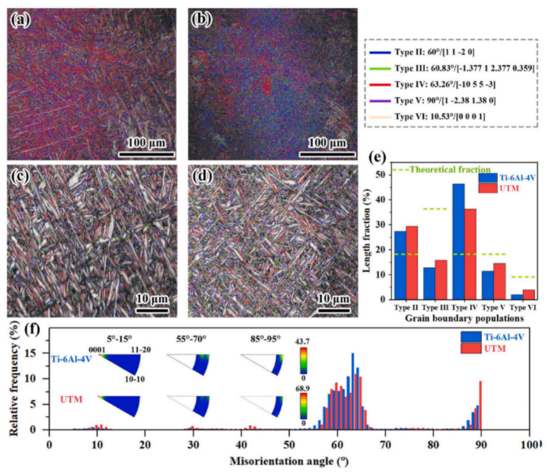 图11 晶界群分析:(a, c) Ti–6Al–4V 和 (b, d) UTM 合金的晶界图,以及 (e) α/α晶粒的长度分数边界和(f)方向错误的角度分布。