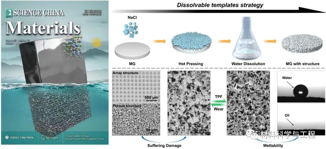以AAO模板来制备的纳米线结构是一种单级的阵列结构,且制备完成后需要放入腐蚀性液体(如氢氧化钠溶液)中进行模板的蚀刻,这使得工艺过程耗时、复杂。因此,如何开发一种更简单、更绿色的方式来进行金属玻璃表面结构的可控构筑对其在光热、超疏水等功能应用具有重要的意义。在此背景上,来自深圳大学的研究人员提出了“溶解制造”的概念并成功地制备了多孔和有序阵列结构。得益于金属玻璃在过冷液相区所具有的独特热塑成型能力,他们使用日常生活中常用的食盐作为热塑成型时的模板,在热塑成型后将金属玻璃放置在水中溶解5 min便可以在其表面轻松制备多孔结构。利用这一策略研究人员不仅在金属玻璃表面上成功地制备了孔径大小可以人为调整的无序多孔结构,而且还制备了形状规则的阵列结构。此外,该策略还显示出优异的重复构造性能,在同一金属玻璃表面上研究人员对多孔结构进行多次重复构造。相关研究内容以“Manufacture of porous metallic glass using dissolvable templates”为题,以封面文章的形式发表在SCIENCE CHINA Materials 。
