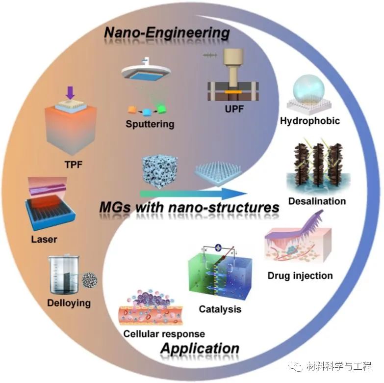 图四.带有纳米结构的金属玻璃的先进加工方式及其功能应用