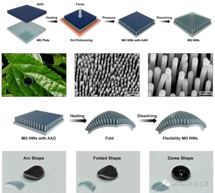 与以往通过调节元素配比来发现新型金属材料的方式不同,原则上,金属材料的尺寸处于微米或纳米级时,其自身特性便上会发生明显的变化。这也为设计具有优异性能的新型金属材料带来了灵感。各种不同形态的微纳米金属材料目前已经在环境,催化,检测和能源等领域广泛应用。由于金属材料独特的光学和机械性能,最近微纳米金属材料在光热领域的贡献尤为显著。然而,如何利用宏观金属材料高效地制备特定尺寸的微纳金属材料仍是一个亟待解决的问题。在这一研究背景下,来自深圳大学的研究人员利用金属玻璃独特的热塑性打破了这一窘境,利用这一性能他们在其表面制备了一系列大面积且跨尺度的功能性结构如规则形状的微米阵列,纳米线以及微纳米多孔。