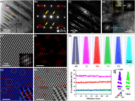 N3.2 HEA-PRX材料的SRO和板条结构分析。(a)板条结构TEM显微图。(b)沿[112]γ轴的SAED,取自(a)中红色虚线圈。(c)取自(a)中白色虚线矩形的暗场TEM显微照片。(d)取自(a)中沿[112]γ轴的红色虚线圈的HRTEM图像,显示板条/奥氏体基体界面附近的区域。(e)沿[112]γ轴的STEM-HAADF图像取自(a)中的蓝色虚点圆和带有扩散散射的FFT图样。(f)显示SRO域的IFFT图像。(g)覆盖fcc晶格的SRO IFFT图像。插图是从绿色虚线矩形中截取的SRO域的特写视图。(h) SRO的IFFT图像与(e)对应的ABF图像叠加。插图取自绿色虚线矩形,表示间隙N原子的分布。(i)从(a)中橙色针状区域提取的分析样品中,显示所有元素均匀分布的APT图,以及沿样品纵向采集的原子组分的一维浓度分布图。给出了相应的透射菊池衍射(TKD)取向图(RD和ND样品方向着色的逆极图),表明奥氏体的{110}<112>取向。未标度区域是靠近奥氏体矩阵的板条。