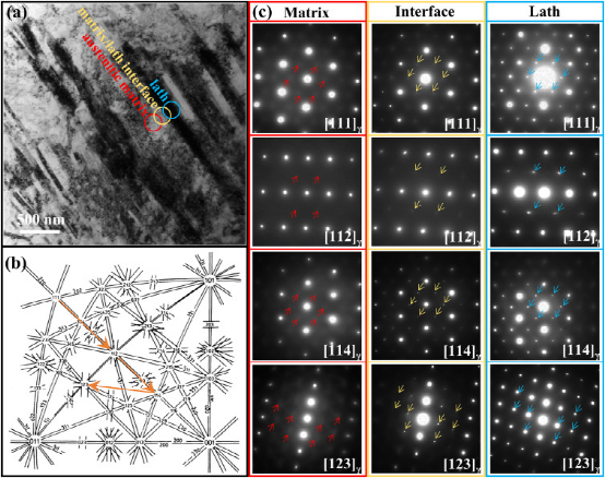 N3.2 HEA-PRX材料中SRO和化学有序板条的证据。(a)板条和奥氏体基体的TEM显微图。(b) fcc结构的菊池图。(c)沿[111]γ、[112]γ、[114]γ和[123]γ带轴从奥氏体基体、基体/板条界面和板条上获得的SAED图。沿不同轴的检测路径由(b)中的橙色箭头表示。