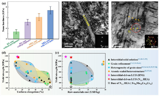 N3.2 HEA-PRX材料的增强和增韧机理。(a)四个典型区域的统计纳米硬度值,即不含和有析出相的RX区和不含和有板条的NRX区。(b)和(c) N3.2 HEA PRX材料变形断口附近区域的TEM显微图。观察到由LCO-lath/奥氏体基体界面和奥氏体基体中的SRO畴引起的位错堆积,以及多个孪晶。(b)和(c)中的插图分别显示了双光束条件和[011]γ轴下的衍射图样。(d) N3.2 HEA-PRX和HNS-PRX材料的拉伸性能与其他多组分合金的不同增强方法(主要从间隙固溶体增强、晶粒细化、晶粒尺寸的非均质性和原子尺度的异质结构增强)的比较。(e)屈服强度与合金原材料成本的关系。