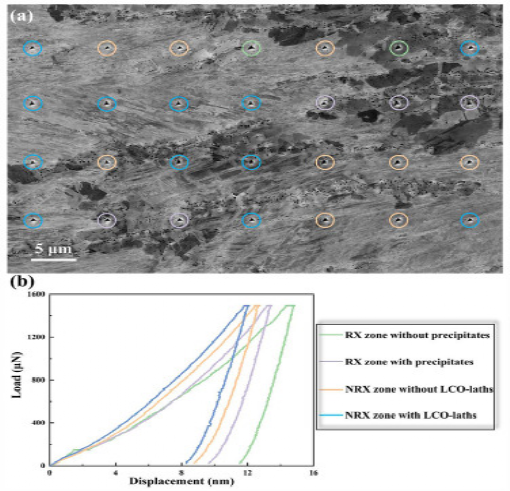 N3.2 HEA-PRX材料各区域的纳米压痕试验。(a)典型的BSE显微图像显示四个典型区域的纳米压痕。压痕压入无析出相和有析出相的RX区,压痕压入无析出相和有板条的NRX区,分别用绿色、紫色、橙色和蓝色圆圈标出。(b)从各区域获得的典型荷载-位移曲线。