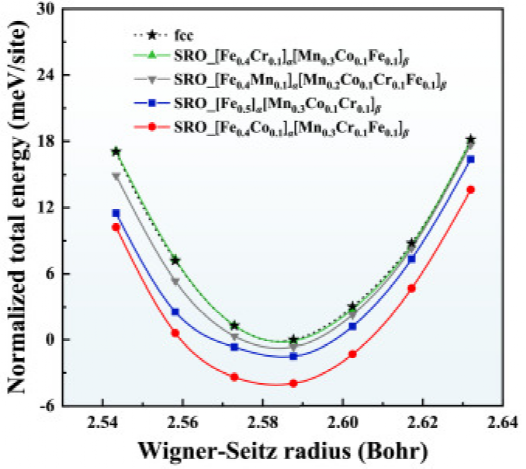 Fe50Mn30Co10Cr10合金在fcc和不同SRO构型下总能量的比较,绘制为Wigner-Seitz半径的函数。考虑了四种SRO构型,即[Fe0.4Cr0.1]α[Mn0.3Co0.1Fe0.1]β, [Fe0.4Mn0.1]α[mn0.2 co0.1 cr0.1]β, [Fe0.5]α[Mn0.3Co0.1Cr0.1]β和[Fe0.4Co0.1]α[Mn0.3Cr0.1Fe0.1]β,其中α和β分别代表SRO内不同的原子位置,如图4(h)三维原子排列模型中的红色和蓝色所示。为了更好地说明,所有的能量都是相对于fcc结构的平衡能量归一化的。每次计算都采用顺磁结构。
