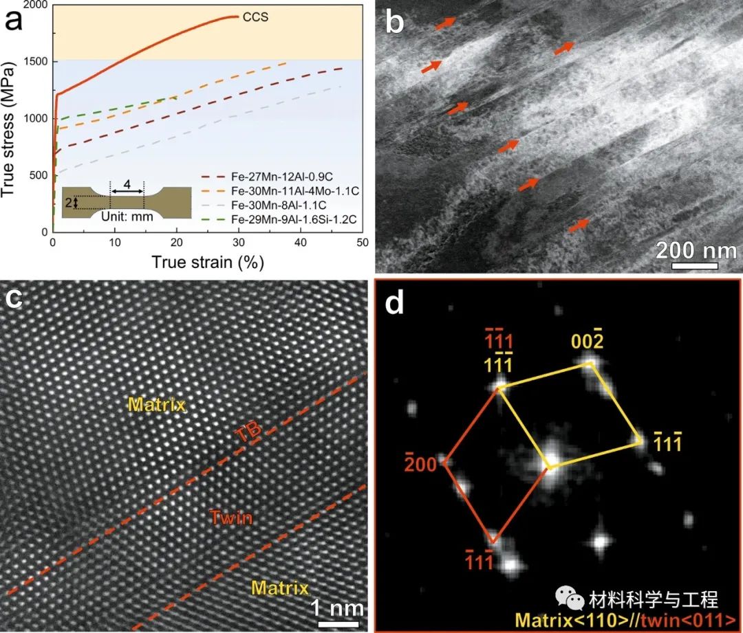 图2 a 在应变速率为10-3s-1的情况下,CCS的真实拉伸应力-应变曲线。插图示意性地显示了大块拉伸样品的几何形状。与我们的CCS具有相似SFE的四种典型轻钢的真实应力-应变曲线(Fe-27Mn-12Al-0.9C、Fe-30Mn-11Al-4Mo-1.1C、Fe-30Mn-8Al-1.1C和Fe-29Mn-9Al-1.6Si-1.2C)作为比较显示。b 局部应变为70%时CCS的变形子结构。红色箭头表示纳米双胞胎。c 高分辨率HAADF图像显示变形纳米孪晶的原子结构。TB表示孪晶界。d 确认孪晶结构的FFT模式。