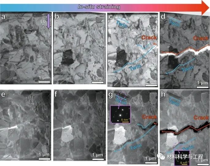 图3 a 在拉伸加载之前 CCS 的起始微观结构。b 位错滑移在变形的早期阶段占主导地位。c 裂纹成核时在不同区域形成机械孪晶。d 裂纹向不同晶粒扩展,而B2与奥氏体基体界面处的断裂受到抑制。g和h中插入的SAED图揭示了孪生结构。LD表示加载方向。