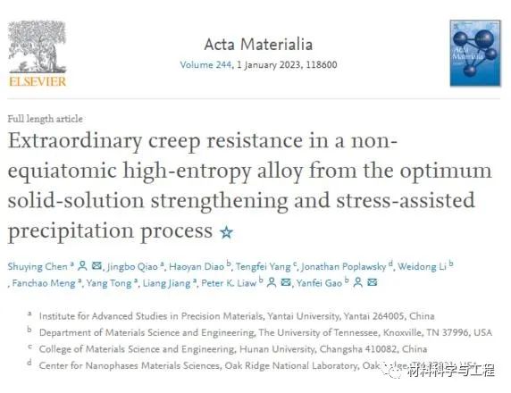 烟台大学陈淑英副教授联合美国田纳西大学和橡树岭国家实验室主导研究了Al0.3CoCrFeNi合金在973-1033 K条件下的蠕变行为。该合金在高温长时加载条件下展现出极其优异的耐蠕变性,比如最小蠕变率比已报道的高熵合金和部分传统合金低至1-4个数量级。研究发现,单相FCC Al0.3CoCrFeNi固溶体合金在长时蠕变中产生外应力驱动内禀自生沉淀强化相,其对合金的变形机制和蠕变性能具有关键影响。据此,创新性地提出利用沉淀强化相大幅提高合金的蠕变强度。上述优异的高温蠕变性能得益于在长时间高温加载时,初始的单相面心立方结构在长时间高温加载环境下形成了大量L12与B2析出相,在合金的高温变形中起到了显著的强化左右,延长了蠕变寿命,并大大降低了高温蠕变率。相关论文以题为:“Extraordinary creep resistance in a non-equiatomic high-entropy alloy from the optimum solid-solution strengthening and stress-assisted precipitation process”发表在金属顶刊《Acta Materialia》。