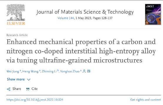 在目前的工作中,制备了C-N共掺杂Fe48.5Mn30Co10Cr10C0.5N1.0 iHEA。随后,使用1.74应变的冷轧和不同温度和时间的退火来调整微观结构。获得了由完全再结晶UFGs组成的Fe48.5Mn30Co10Cr10C0.5N1.0 iHEA,具有出色的强度和延展性组合。进行了跳转测试,以研究潜在的热激活过程。南京理工大学赵永好教授团队对此进行了研究,报告了详细的微观结构调查。相关研究成果以“Enhanced mechanical properties of a carbon and nitrogen co-doped interstitial high-entropy alloy via tuning ultrafine-grained microstructures” 发表在Journal of Materials Science & Technology上。