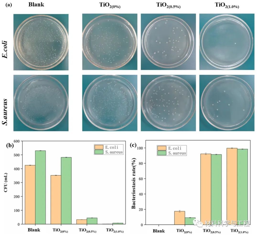 图 7。(a)空白样品和PHBV/PBAT/TiO 2纳米纤维膜对大肠杆菌和金黄色葡萄球菌的抑菌性能,(b)平均菌落形成单位数,(c)对应的抑菌率空白样品和PHBV/PBAT/TiO 2纳米纤维膜。